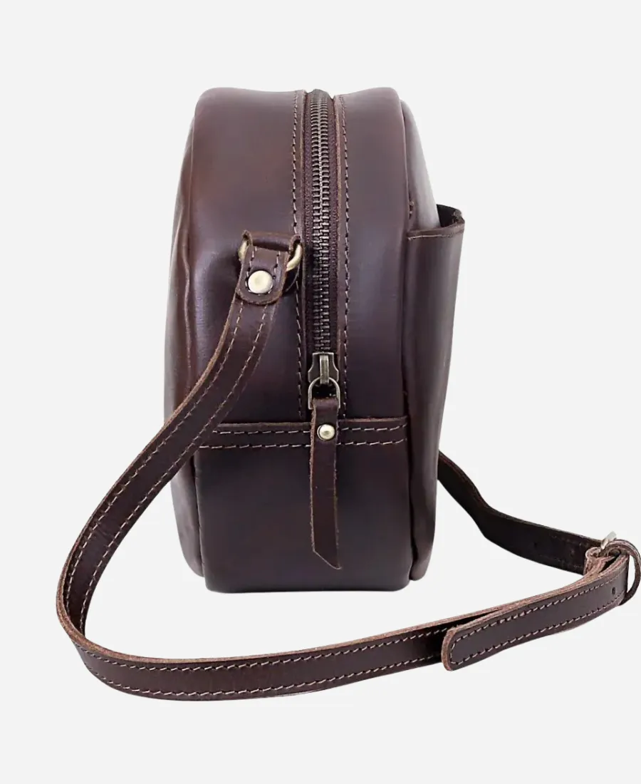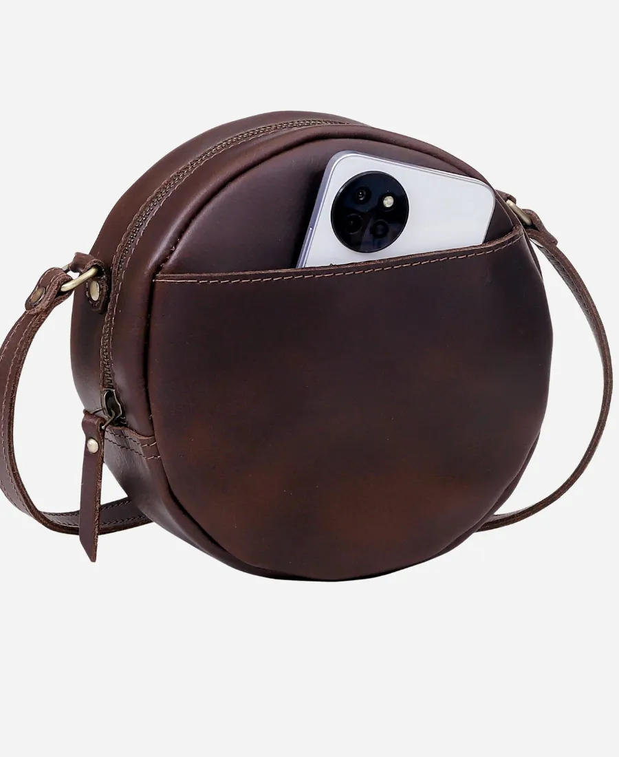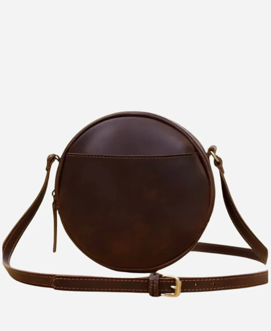 This round crossbody bag is stylish and very practical. The brown leather feels premium and durable, and it fits all my essentials comfortably. Perfect for everyday use.