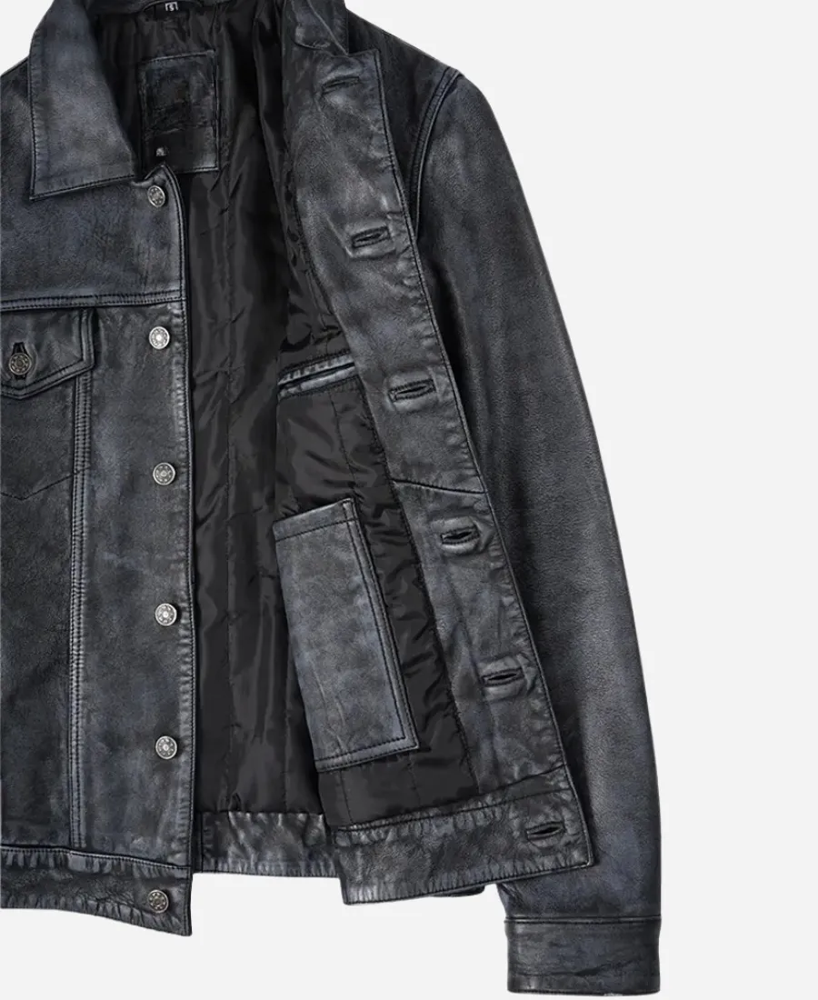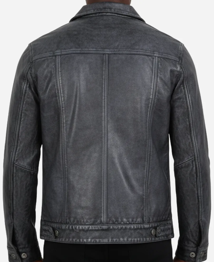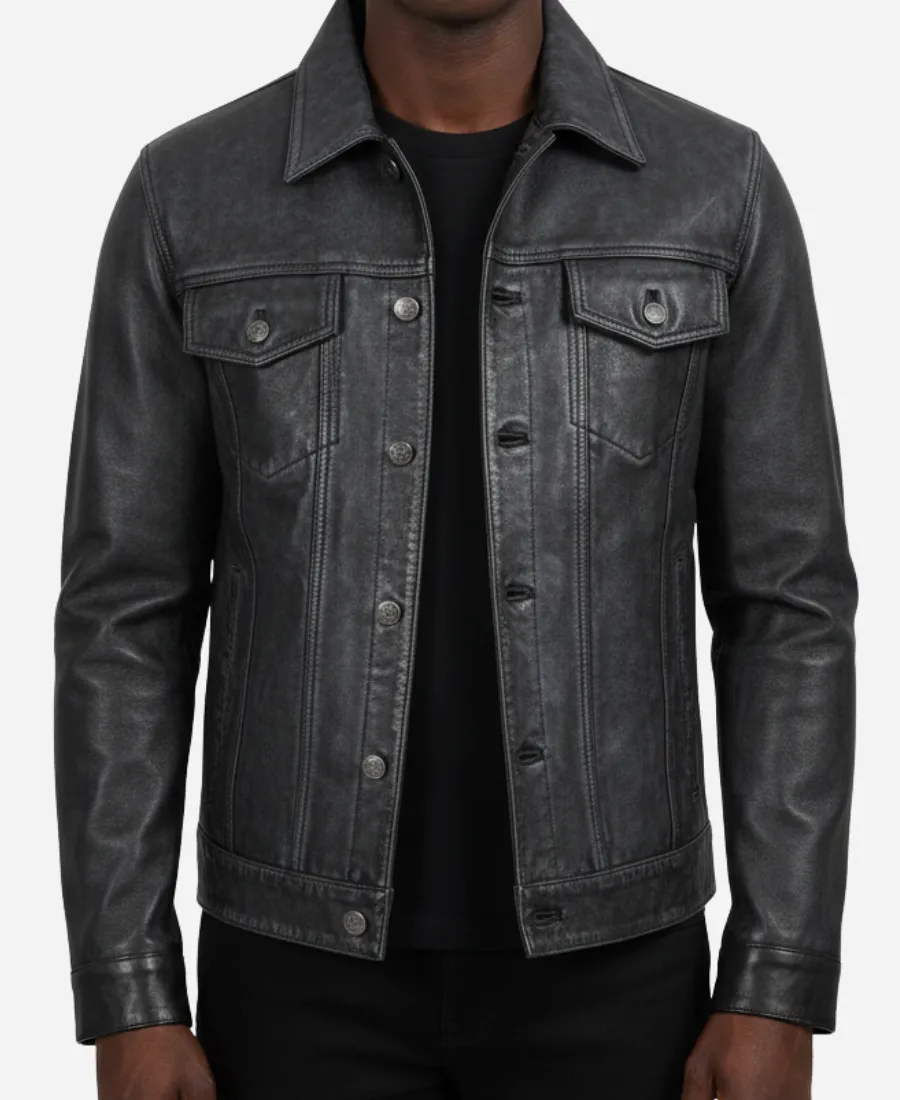 Men Stylish Washed Black Leather Trucker Jacket